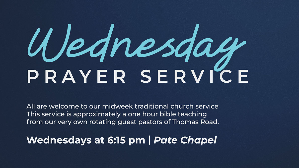 All are welcome to our midweek traditional church service on Wednesday nights starting at 6:15pm in Pate Chapel! This service is approximately a one hour bible teaching from our very own rotating guest pastors of TRBC.